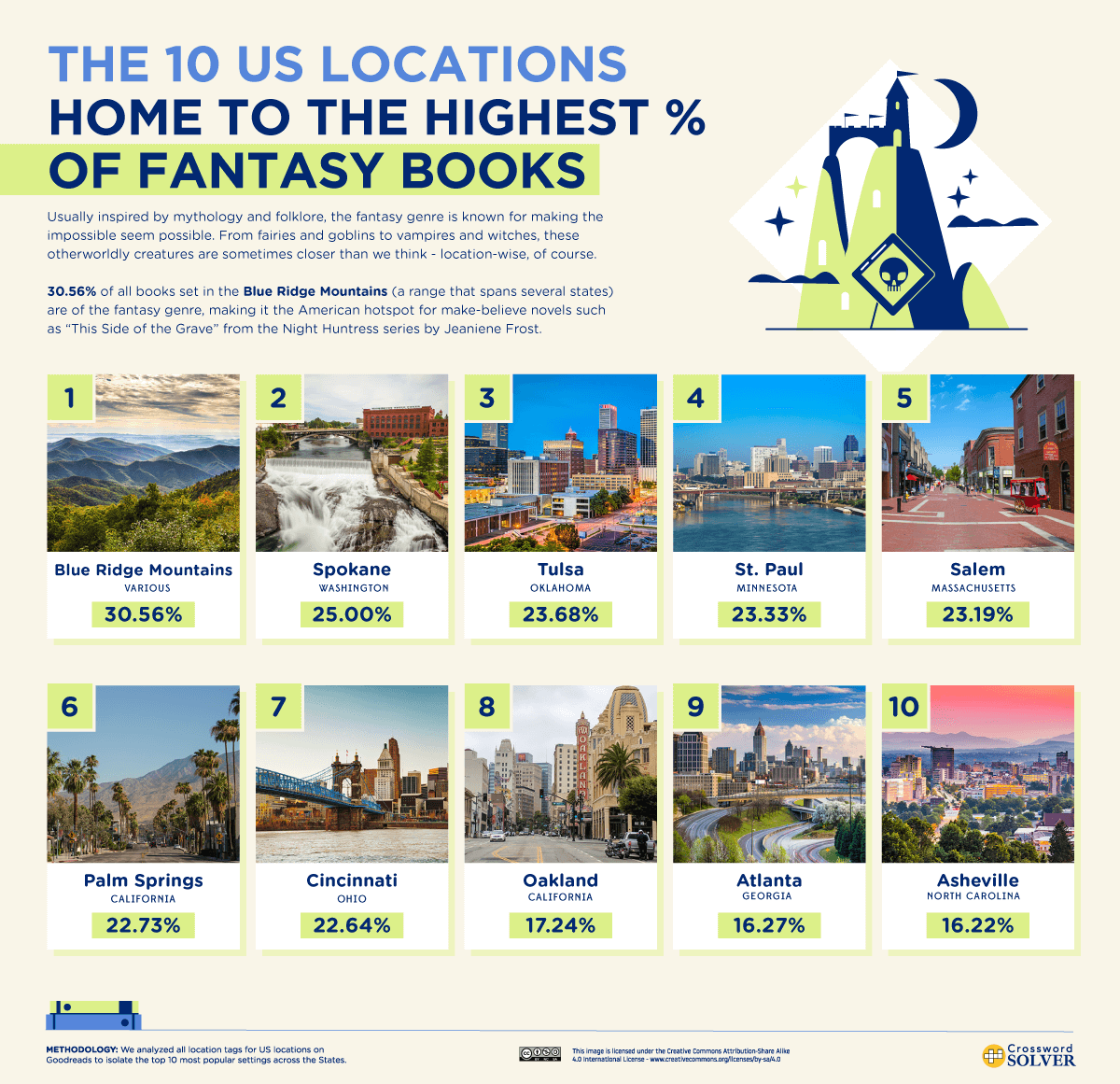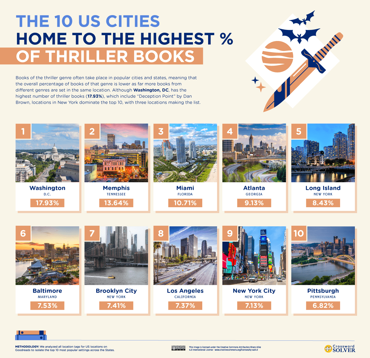 Thrillers tend to take up very little of any location’s literary imagination, with the political intrigues of Washington D.C. on top with just 17.83%. Classic hardboiled crime destinations such as Miami, LA, and NYC exemplify the generally gritty, urban settings where our unshaven heroes and heroines race against the clock to save the dame/city/violin.