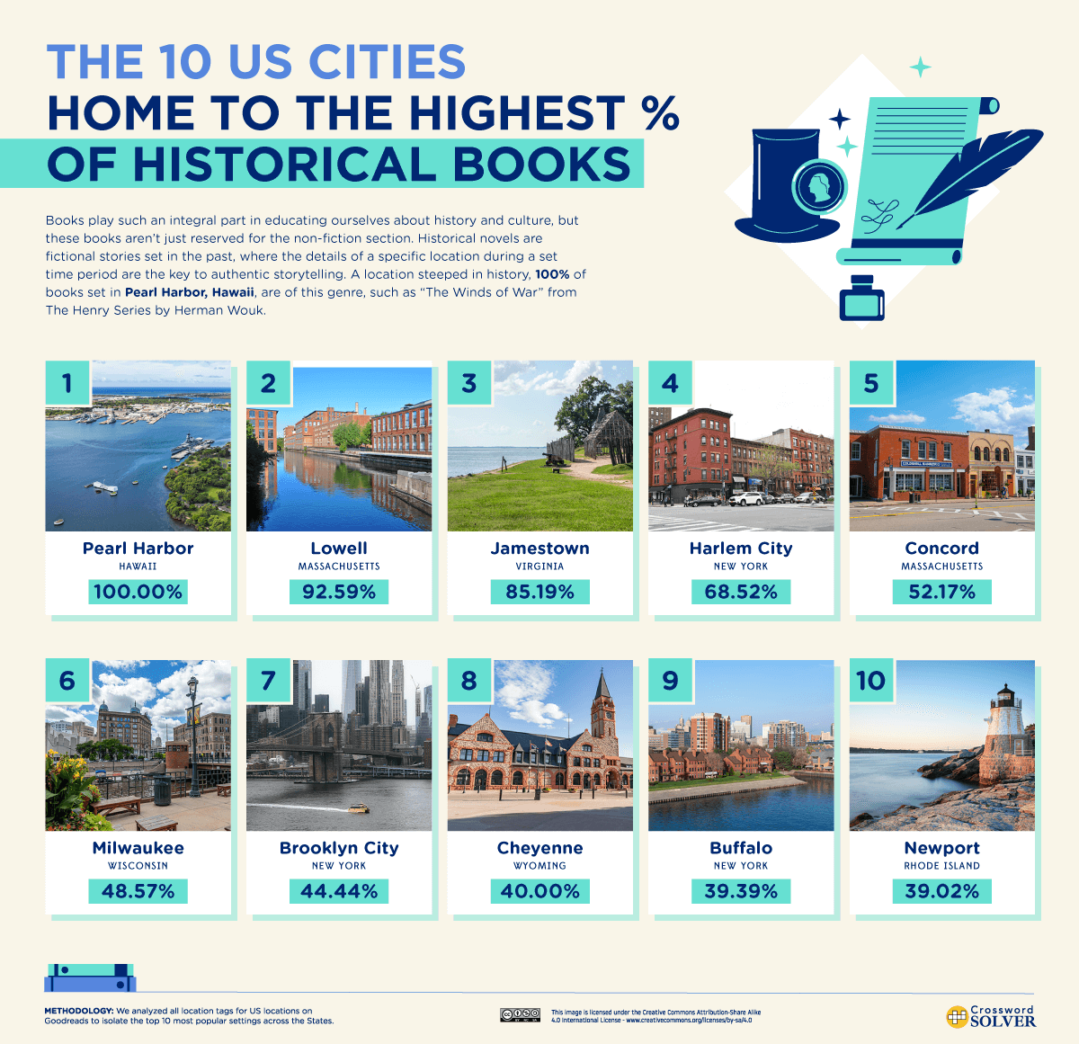 New York is the state that provides the setting for the highest number of novels. We found 4,887 books set in New York locations as diverse as Albany, Lake Placid, and Montauk. Despite the latter’s picturesque settings, it is rumors of Stranger Things-style government experiments on the peninsula that make Montauk a must-visit for authors.