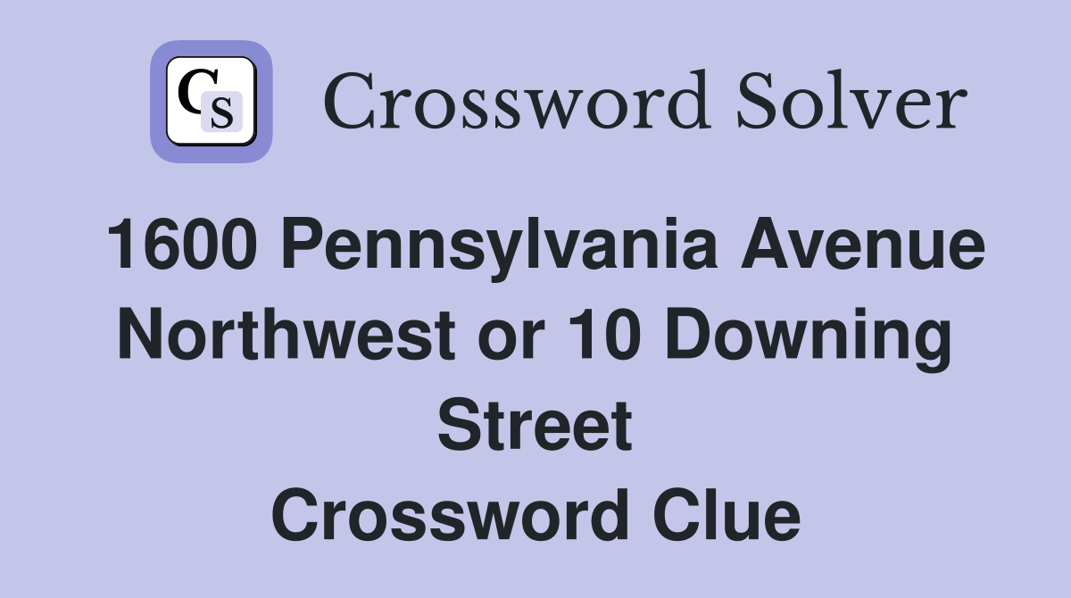 With our crossword solver search engine you have access to over 7 million clues. You can narrow down the possible answers by specifying the number of letters it contains. We found more than 40 answers for 1600 Pennsylvania Avenue Northwest or 10 Downing Street.