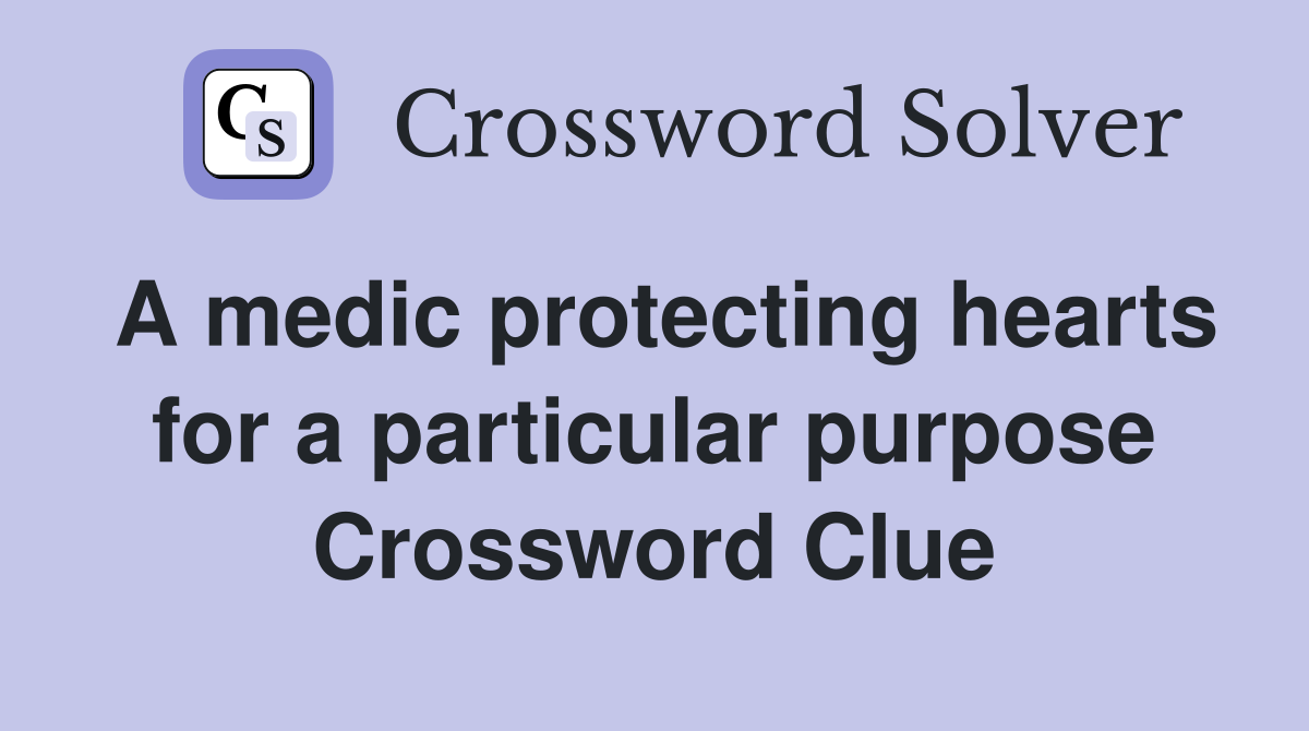 With our crossword solver search engine you have access to over 7 million clues. You can narrow down the possible answers by specifying the number of letters it contains. We found more than 40 answers for A medic protecting hearts for a particular purpose.