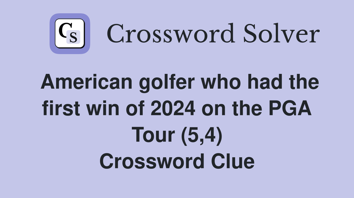 With our crossword solver search engine you have access to over 7 million clues. You can narrow down the possible answers by specifying the number of letters it contains. We found more than 40 answers for American golfer who had the first win of 2024 on the PGA Tour (5,4).