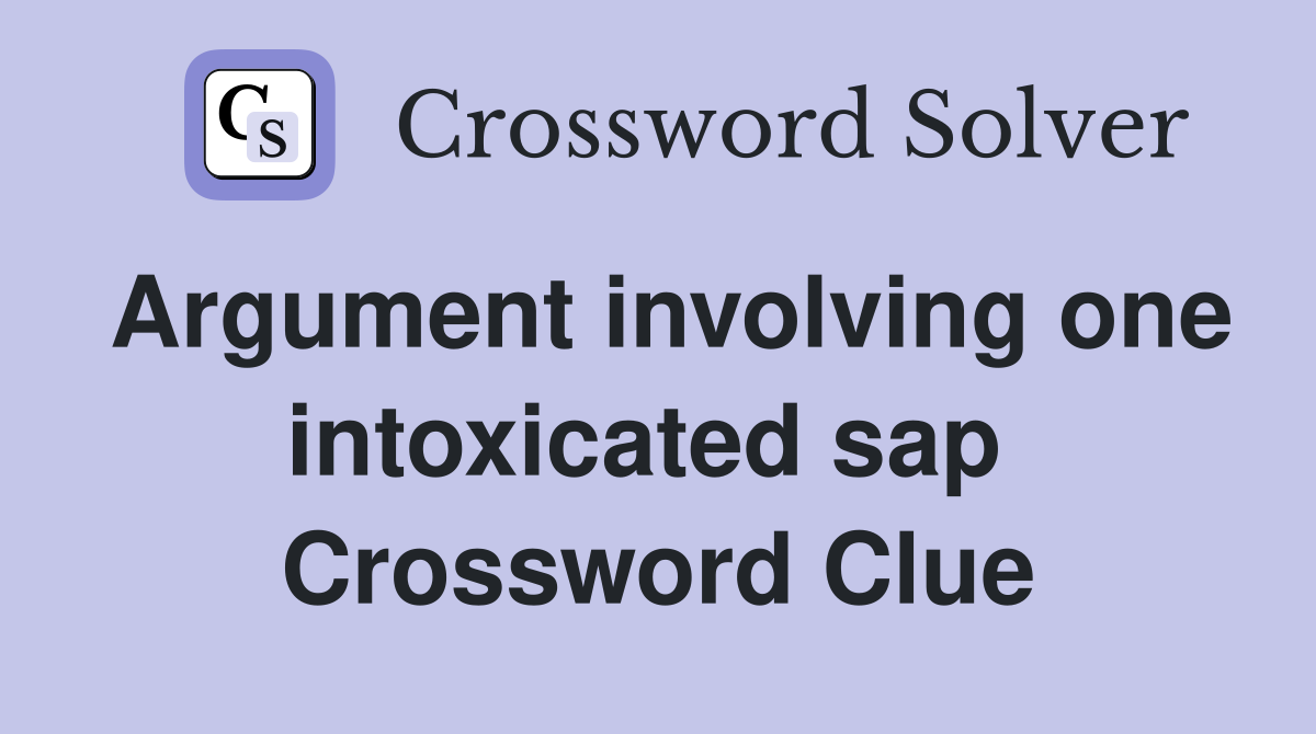 With our crossword solver search engine you have access to over 7 million clues. You can narrow down the possible answers by specifying the number of letters it contains. We found more than 40 answers for Argument involving one intoxicated sap .