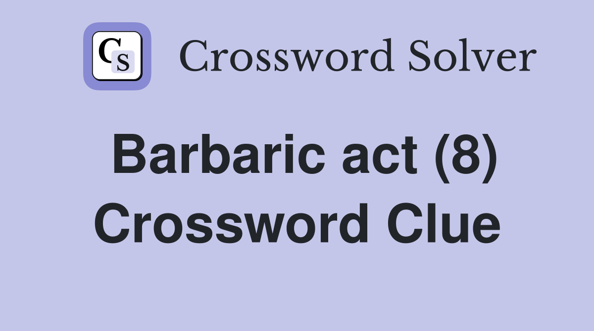 Here is the answer for the crossword clue Barbaric act (8) . We have found 40 possible answers for this clue in our database. Among them, one solution stands out with a 98% match which has a length of 8 letters. We think the likely answer to this clue is ATROCITY.