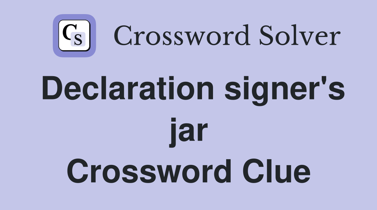 With our crossword solver search engine you have access to over 7 million clues. You can narrow down the possible answers by specifying the number of letters it contains. We found more than 40 answers for Declaration signer's jar.