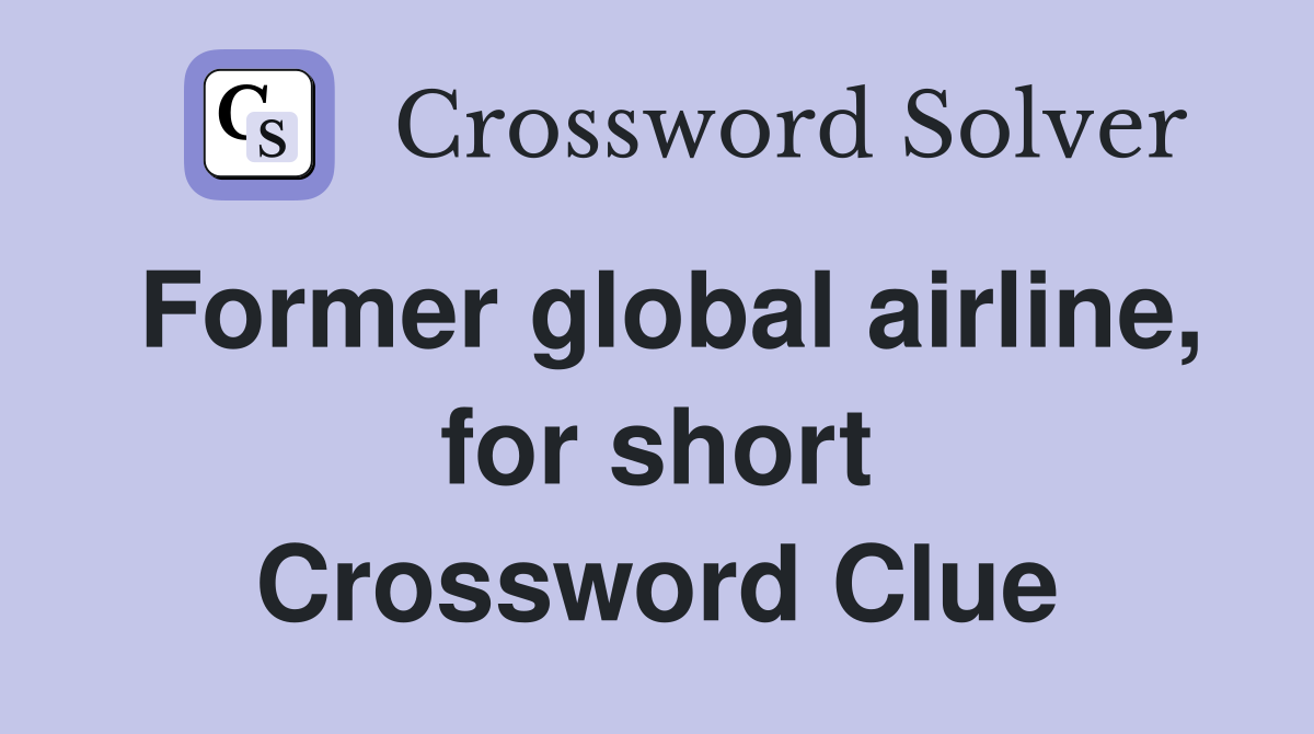 With our crossword solver search engine you have access to over 7 million clues. You can narrow down the possible answers by specifying the number of letters it contains. We found more than 40 answers for Former global airline, for short.