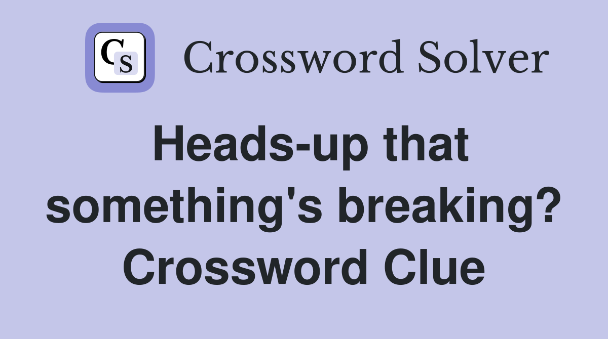 With our crossword solver search engine you have access to over 7 million clues. You can narrow down the possible answers by specifying the number of letters it contains. We found more than 40 answers for Heads-up that something's breaking?.