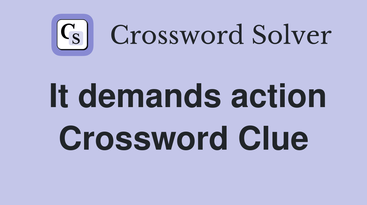 With our crossword solver search engine you have access to over 7 million clues. You can narrow down the possible answers by specifying the number of letters it contains. We found more than 40 answers for It demands action.