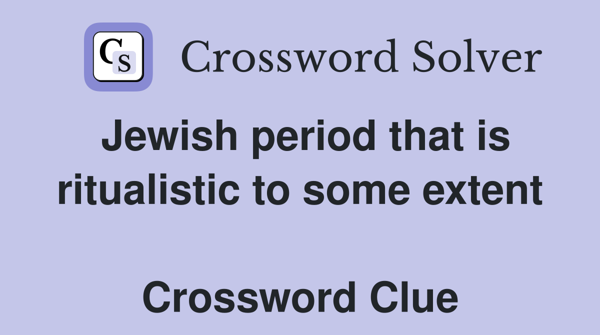 With our crossword solver search engine you have access to over 7 million clues. You can narrow down the possible answers by specifying the number of letters it contains. We found more than 40 answers for Jewish period that is ritualistic to some extent .