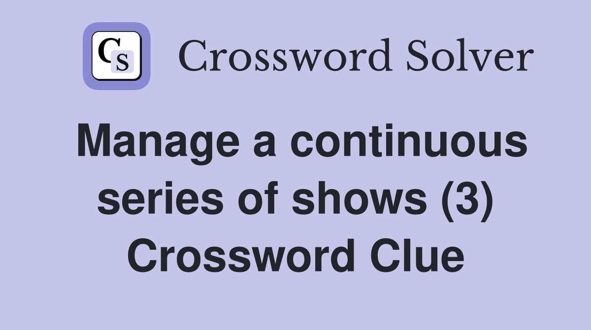 With our crossword solver search engine you have access to over 7 million clues. You can narrow down the possible answers by specifying the number of letters it contains. We found more than 40 answers for Manage a continuous series of shows (3).