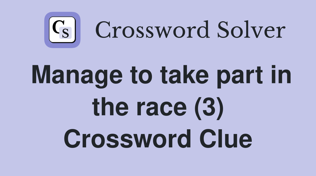 With our crossword solver search engine you have access to over 7 million clues. You can narrow down the possible answers by specifying the number of letters it contains. We found more than 40 answers for Manage to take part in the race (3).