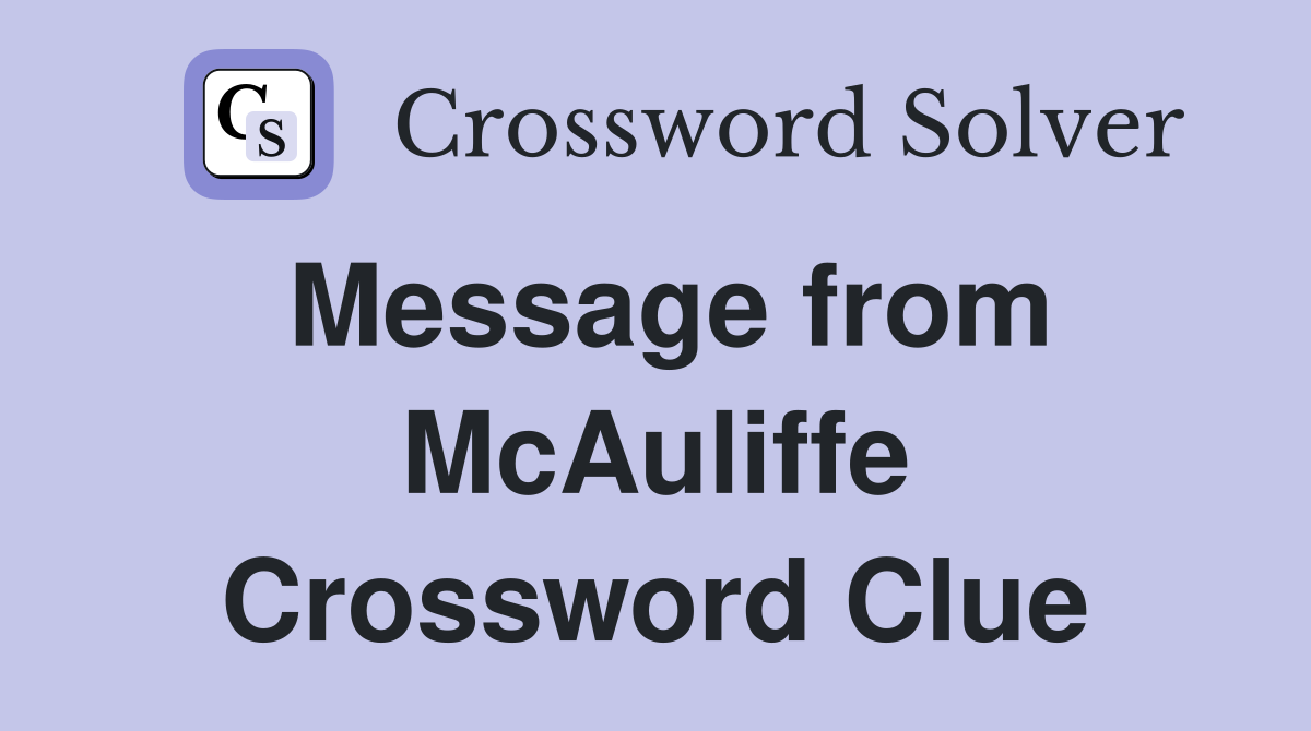 With our crossword solver search engine you have access to over 7 million clues. You can narrow down the possible answers by specifying the number of letters it contains. We found more than 40 answers for Message from McAuliffe.