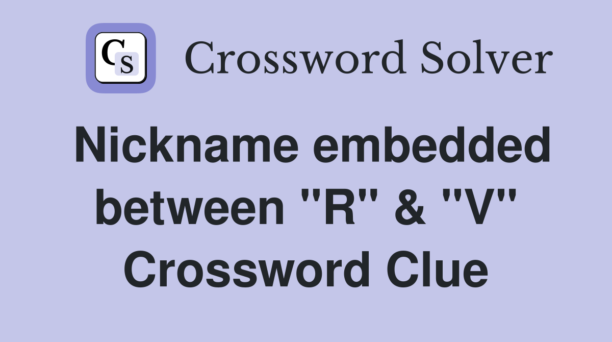 With our crossword solver search engine you have access to over 7 million clues. You can narrow down the possible answers by specifying the number of letters it contains. We found more than 40 answers for Nickname embedded between "R" & "V".