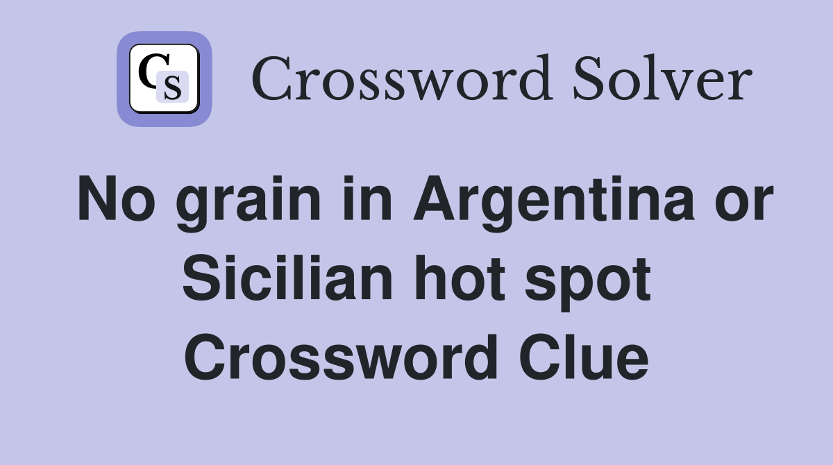 With our crossword solver search engine you have access to over 7 million clues. You can narrow down the possible answers by specifying the number of letters it contains. We found more than 40 answers for No grain in Argentina or Sicilian hot spot.