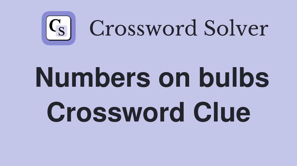 Here is the answer for the crossword clue Numbers on bulbs . We have found 40 possible answers for this clue in our database. Among them, one solution stands out with a 98% match which has a length of 8 letters. We think the likely answer to this clue is WATTAGES.