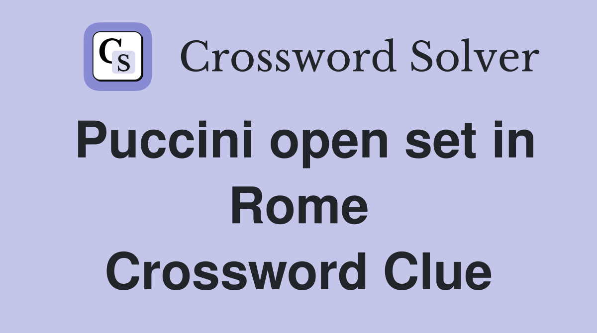 Here is the answer for the crossword clue Puccini open set in Rome . We have found 40 possible answers for this clue in our database. Among them, one solution stands out with a 98% match which has a length of 5 letters. We think the likely answer to this clue is TOSCA.