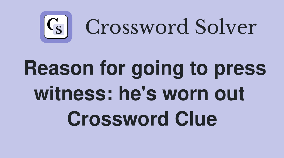With our crossword solver search engine you have access to over 7 million clues. You can narrow down the possible answers by specifying the number of letters it contains. We found more than 40 answers for Reason for going to press witness: he's worn out .