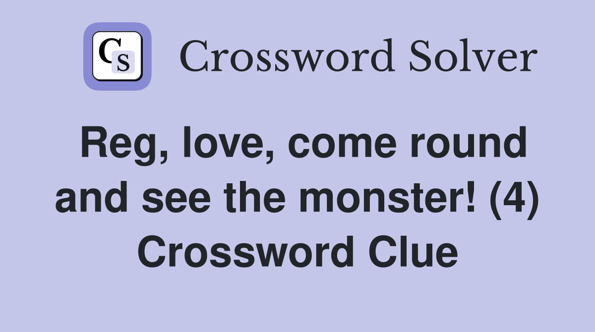 With our crossword solver search engine you have access to over 7 million clues. You can narrow down the possible answers by specifying the number of letters it contains. We found more than 40 answers for Reg, love, come round and see the monster! (4).