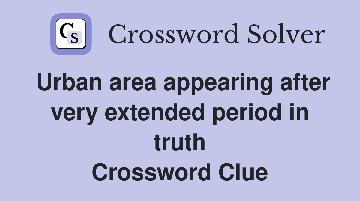 With our crossword solver search engine you have access to over 7 million clues. You can narrow down the possible answers by specifying the number of letters it contains. We found more than 40 answers for Urban area appearing after very extended period in truth.