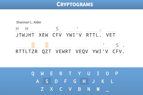 Cryptograms is a game that starts off as a bit of light-hearted code-solving fun but soon gets you acting like an FBI agent, solving the world's most important encrypted message. Match the randomized letter to your code, look for patterns, and try to solve the puzzle as quickly as you can; this is a lot of fun!