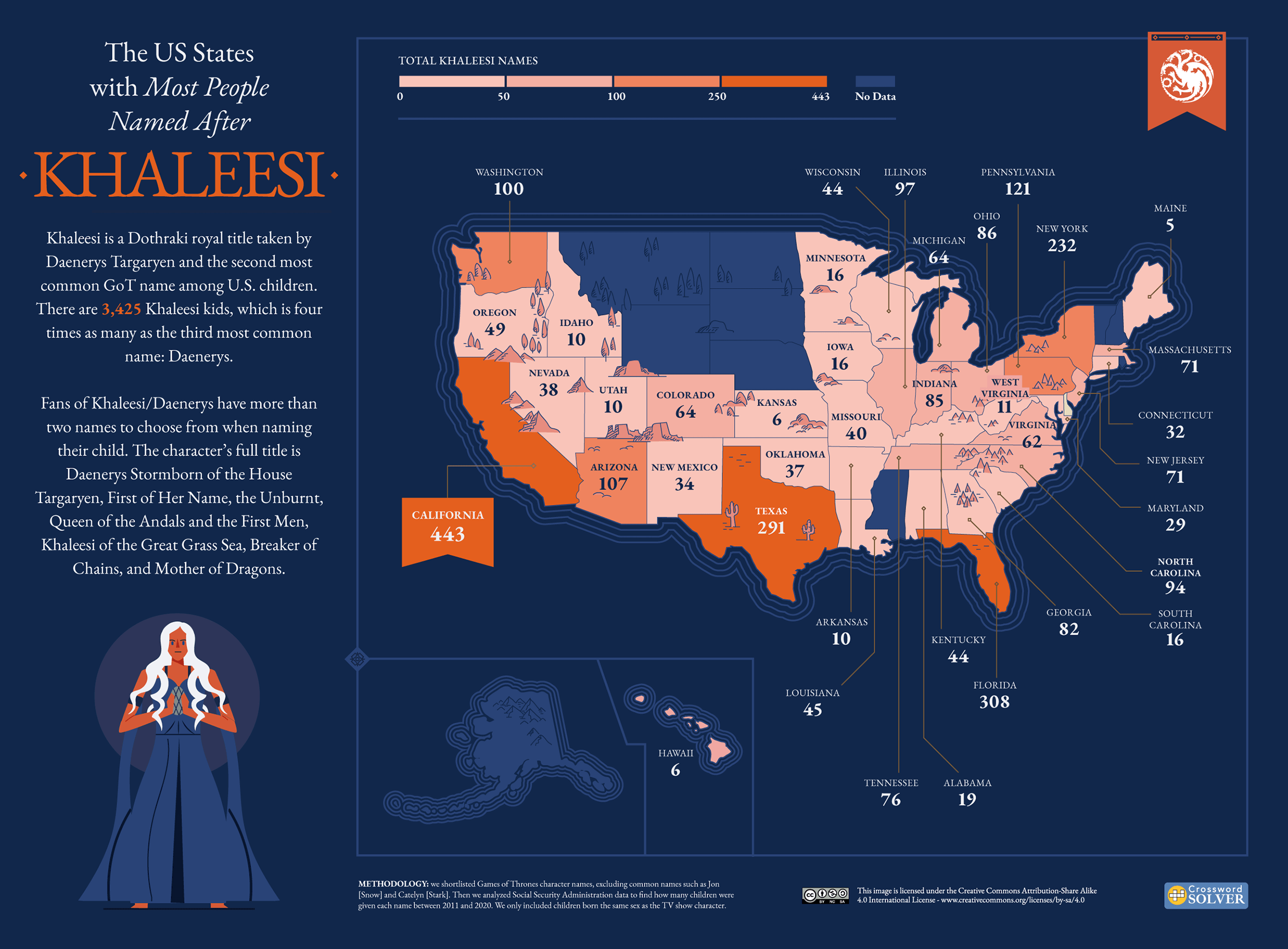 Khaleesi is just one of Daenerys’ many titles, but it has caught America’s imagination. There are seven states with over 100 Khaleesies and just 11 states with none at all. As well as its exotic and regal tone, Khaleesi connotes strength and resilience. “She’s definitely a woman who knows her power, knows what she wants,” as one Khaleesi mama told the New York Times.