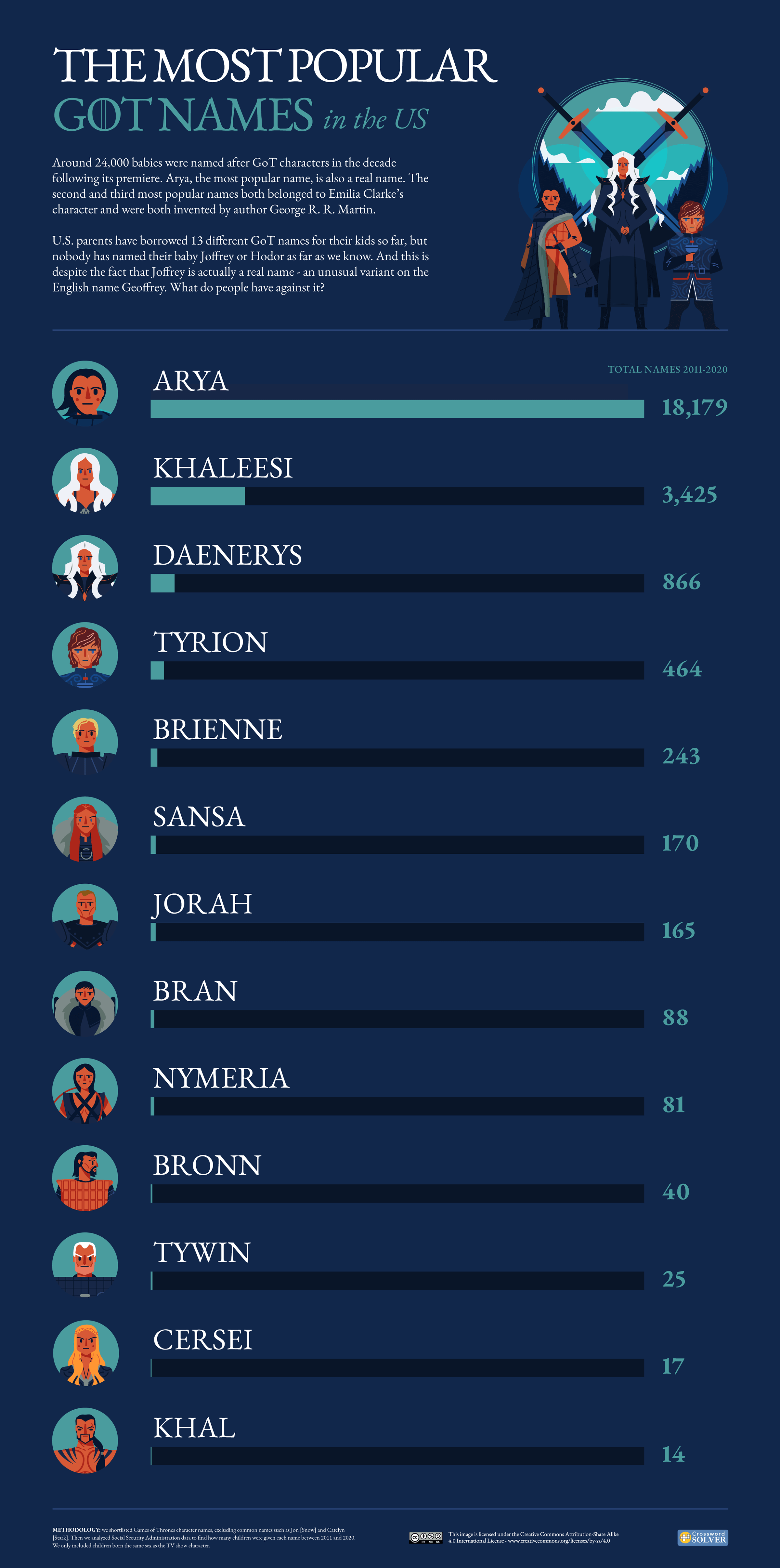 Arya and Daenerys/Khaleesi account for 94.5% of GoT children’s names in the U.S. But Tyrion, Brienne, Sansa, and Jorah each have a respectable three-figure showing, too. Sansa, like Arya, is a name of Sanskrit origin, in this case meaning ‘praise.’