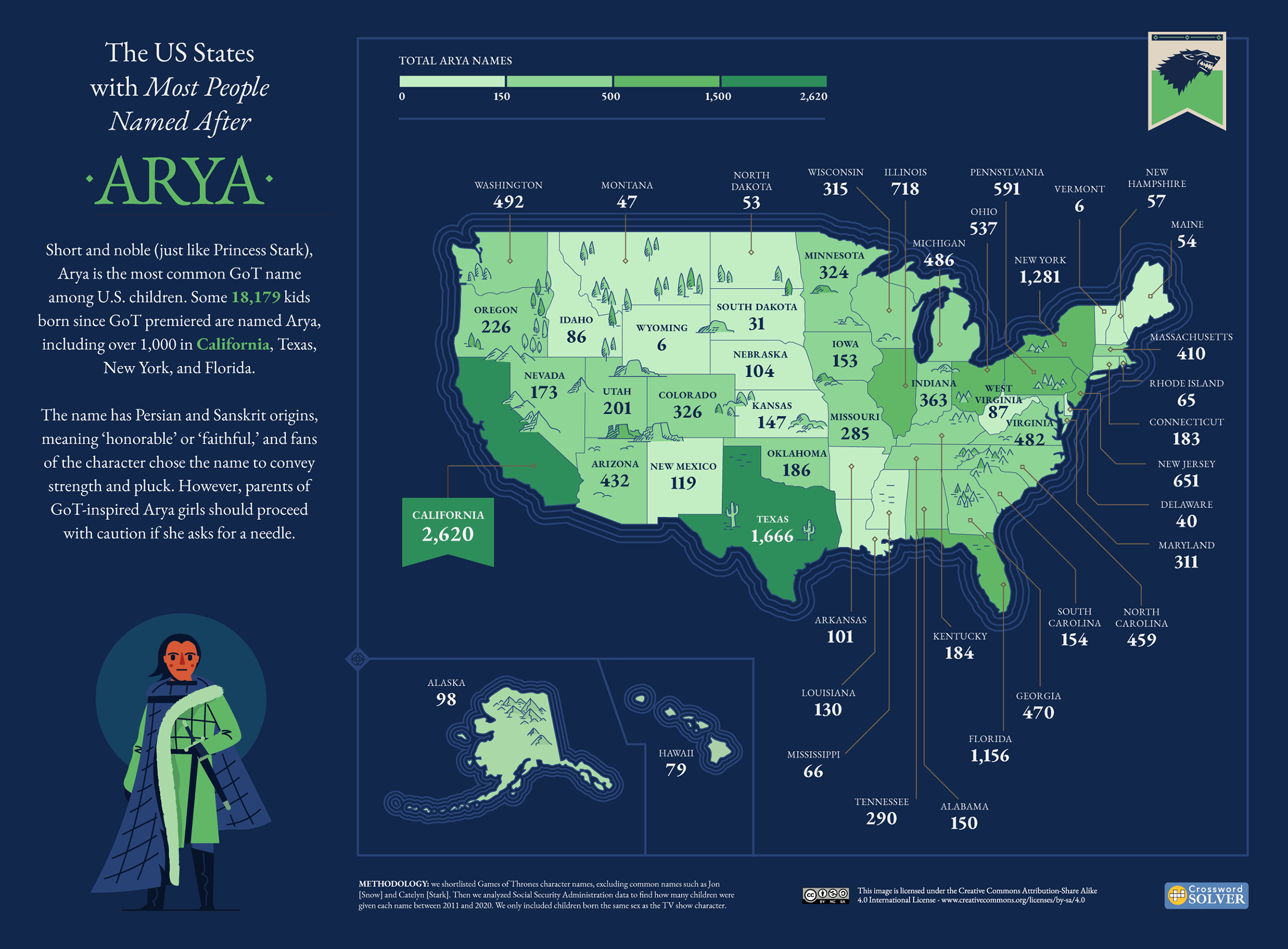 Crossword-Solver’s word boffins analyzed Martin’s naming conventions to figure out what he might do to make your name sound more Thronesy. And to back up our belief that People Want GoT Names, we analyzed census bureau data to find how many Westerosi-inspired babies have been born in every U.S. state over the past decade.