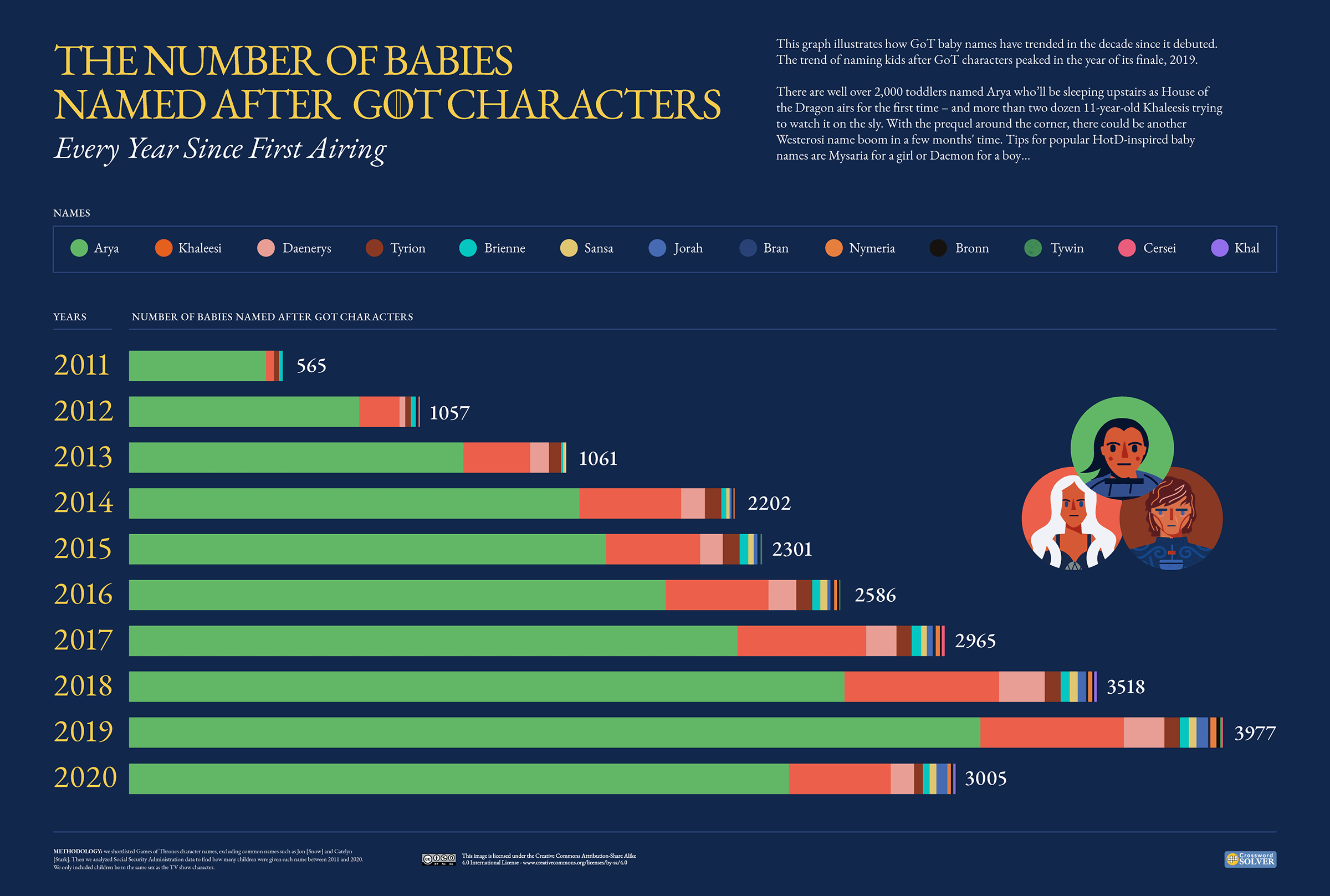 The number of children named after Game of Thrones characters rose six-fold between the show’s 2011 launch and the trend’s peak, which coincided with the show’s finale in 2019. One year on – and with many fans still nursing their wounds – the production of GoT babies fell by 24.8%.