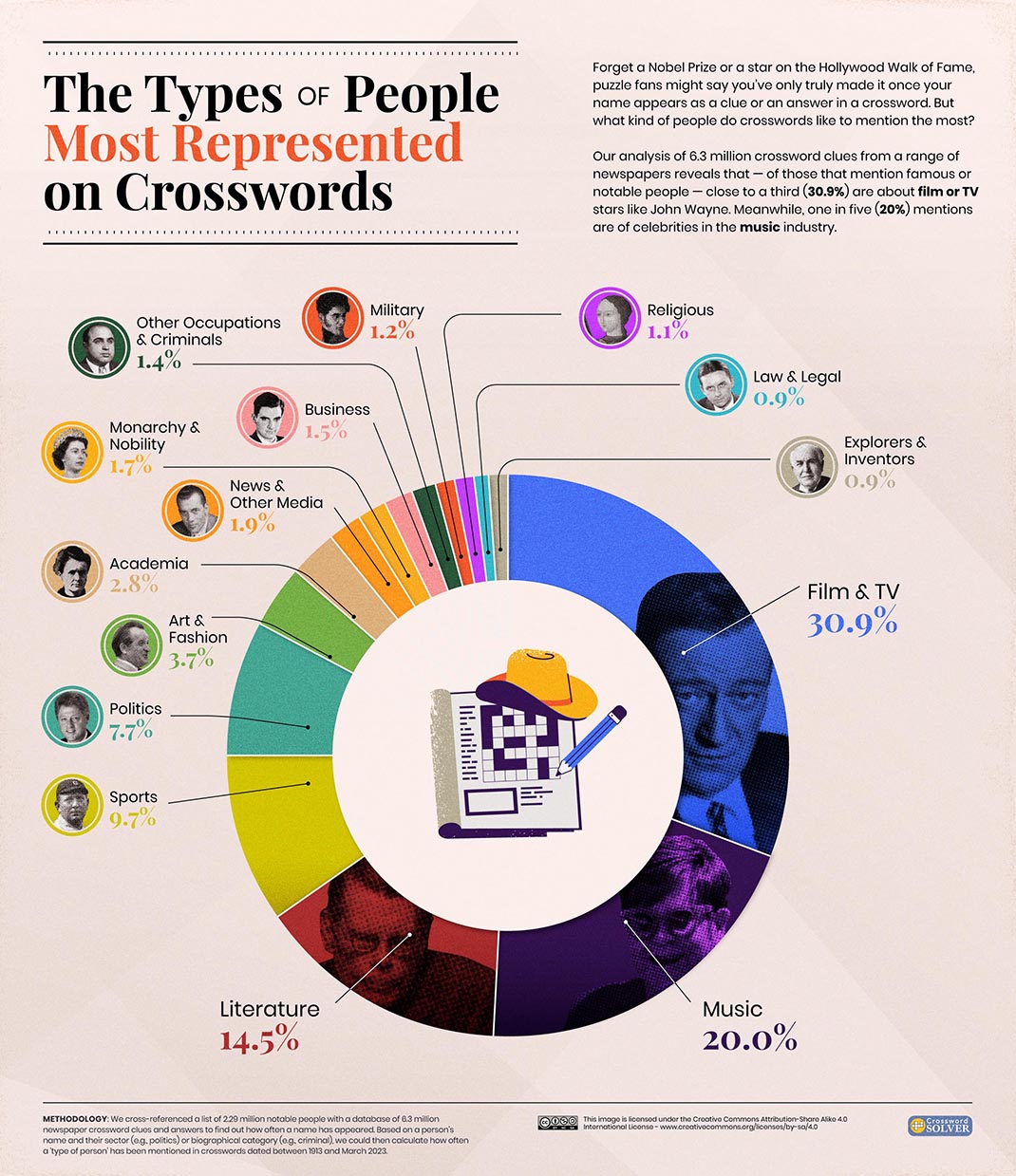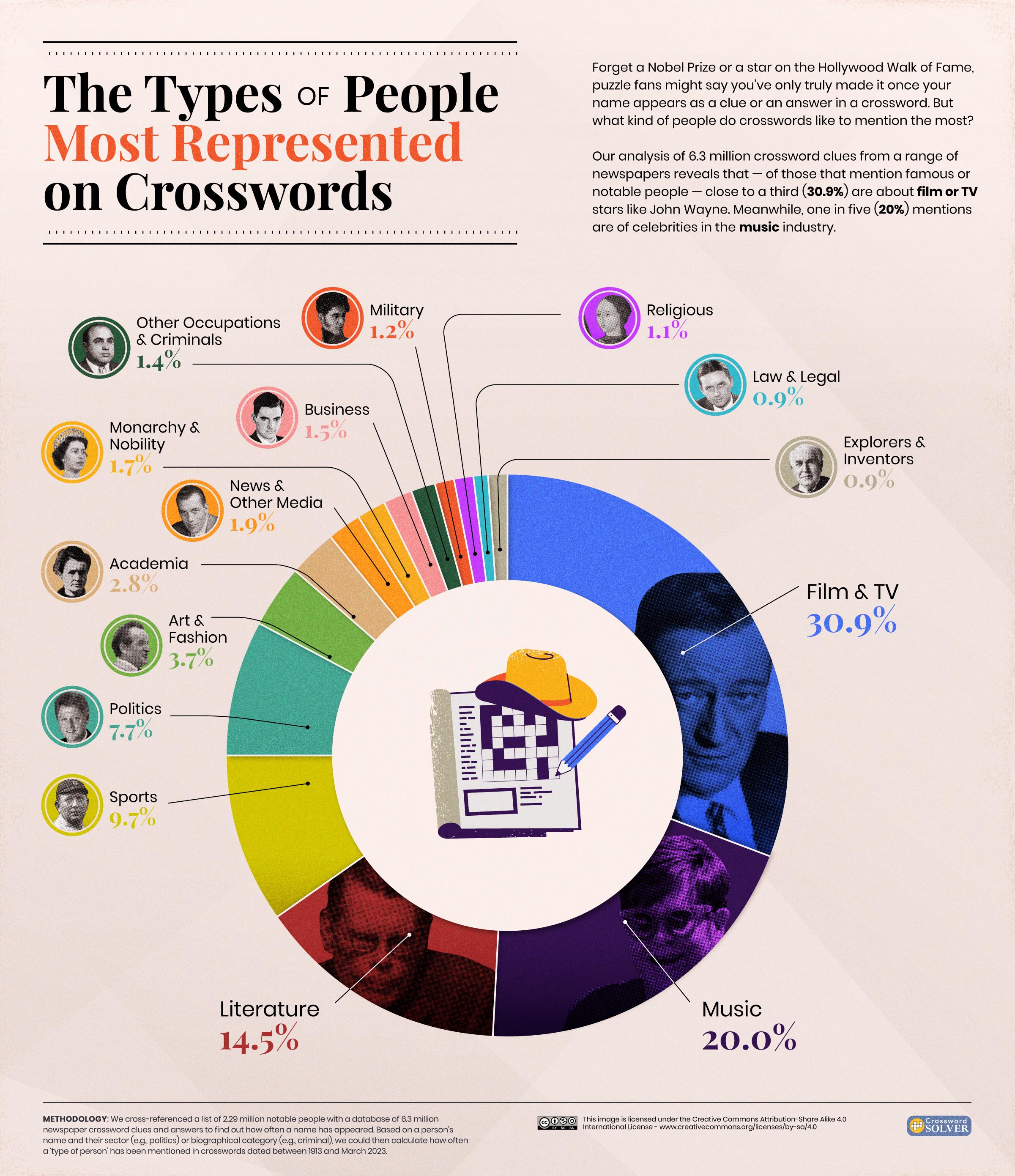 More than half of the people mentioned in crossword clues are film and TV stars (30.9%) or musicians (20.0%). The big names of literature, sports and politics make a splash, too, followed by a long tail of poorly represented professions: royal names account for just 1.7% of celebrity crossword clues and answers, and religious figures score just 1.1%.
