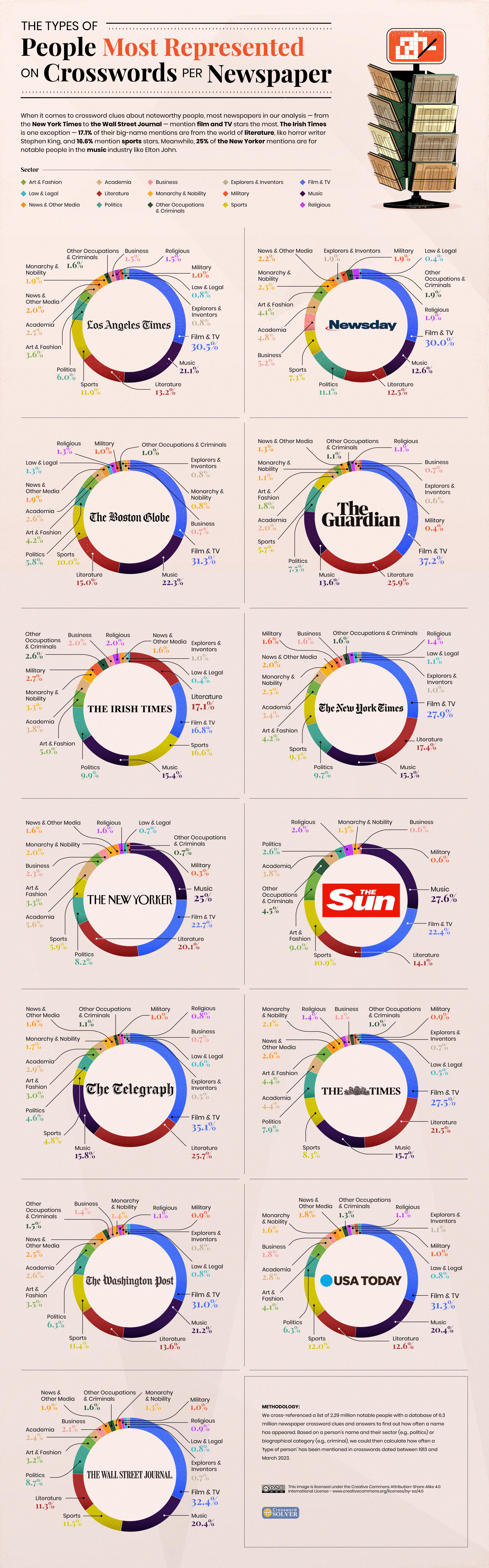 Crossword Solver cross-referenced a list of 2.29 million notable people with a database of 6.3 million newspaper crossword clues and answers to find out how often a name has appeared in crosswords dated between 1913 and March 2023. We categorized the people by industry and calculated how many of each type have appeared in each U.S. and UK newspaper. We also made a year-by-year breakdown for the New York Times crossword.