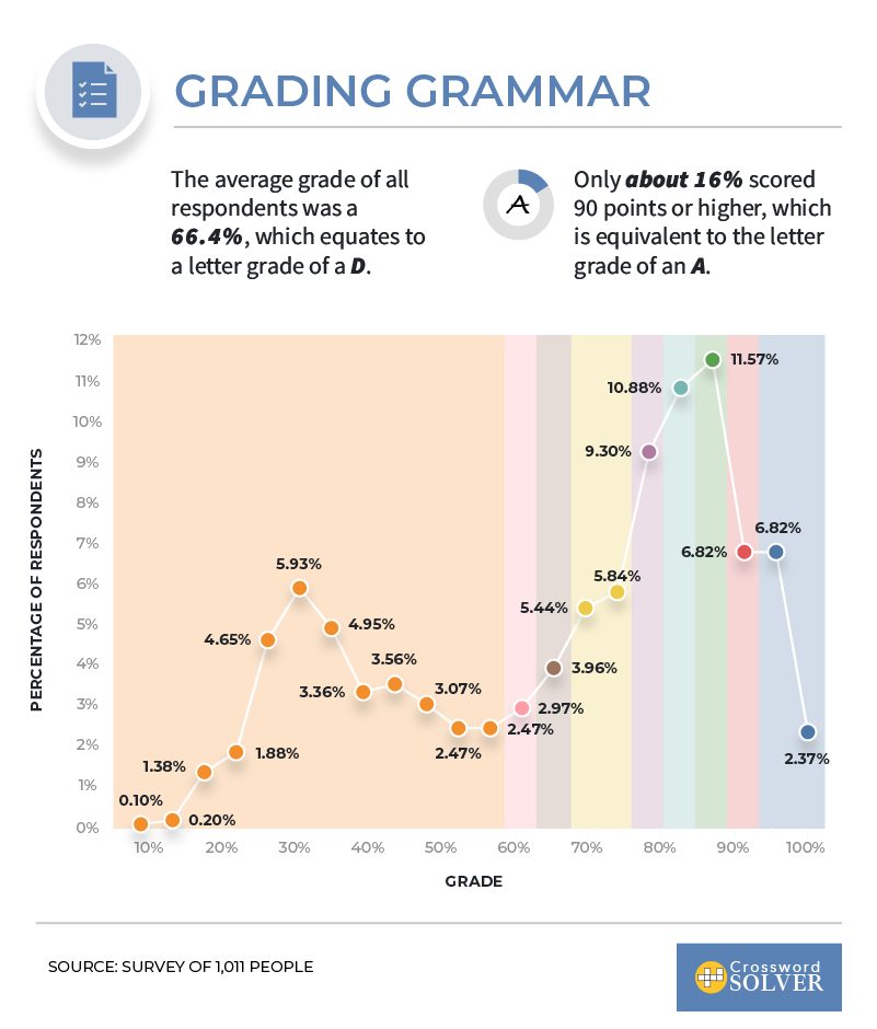 It doesn’t matter whether you’re an English teacher, a crossword puzzle genius, or even if you have a college degree, human error is part of life. This becomes even more evident as we see that the average quiz grade of survey respondents was the equivalent of a D. Only roughly 16% scored 90 points or higher, which is equivalent to a letter grade of an A or A-.