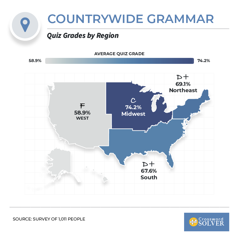 We’ve seen how gender, age, and determinants like political affiliation and frequency of reading affected respondents’ scores, and now we look to where these respondents reside. Overall, people who live in Midwestern states scored the highest, a C average, while West Coast residents failed, scoring less than 60%.