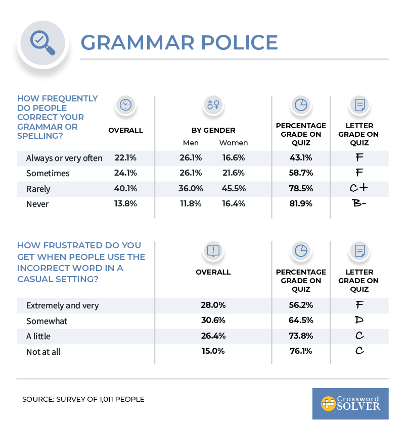 There are some people who never fail to take advantage of a moment to correct someone’s grammar. Those “grammar police” can get frustrated when they hear other people speak incorrectly while in conversation (or sometimes just within earshot). What’s interesting, though, is that the respondents who said they get extremely frustrated by this, actually scored the lowest on their grammar quiz. Those who got the highest scores were rarely annoyed by this at all.