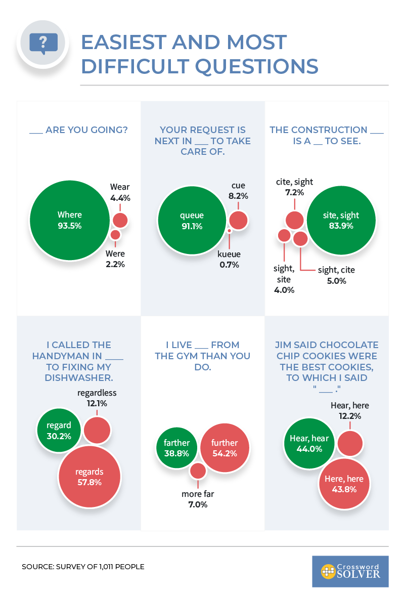 There were some questions that the majority of respondents all guessed accurately, e.g., identifying the correct usage of where versus wear, and queue versus cue. These two, specifically, were answered correctly by over 90% of respondents. It could be that because these words, and the way they were phrased on the quiz, are more standard in normal conversation, and respondents could use context clues if they did not already know the answer.