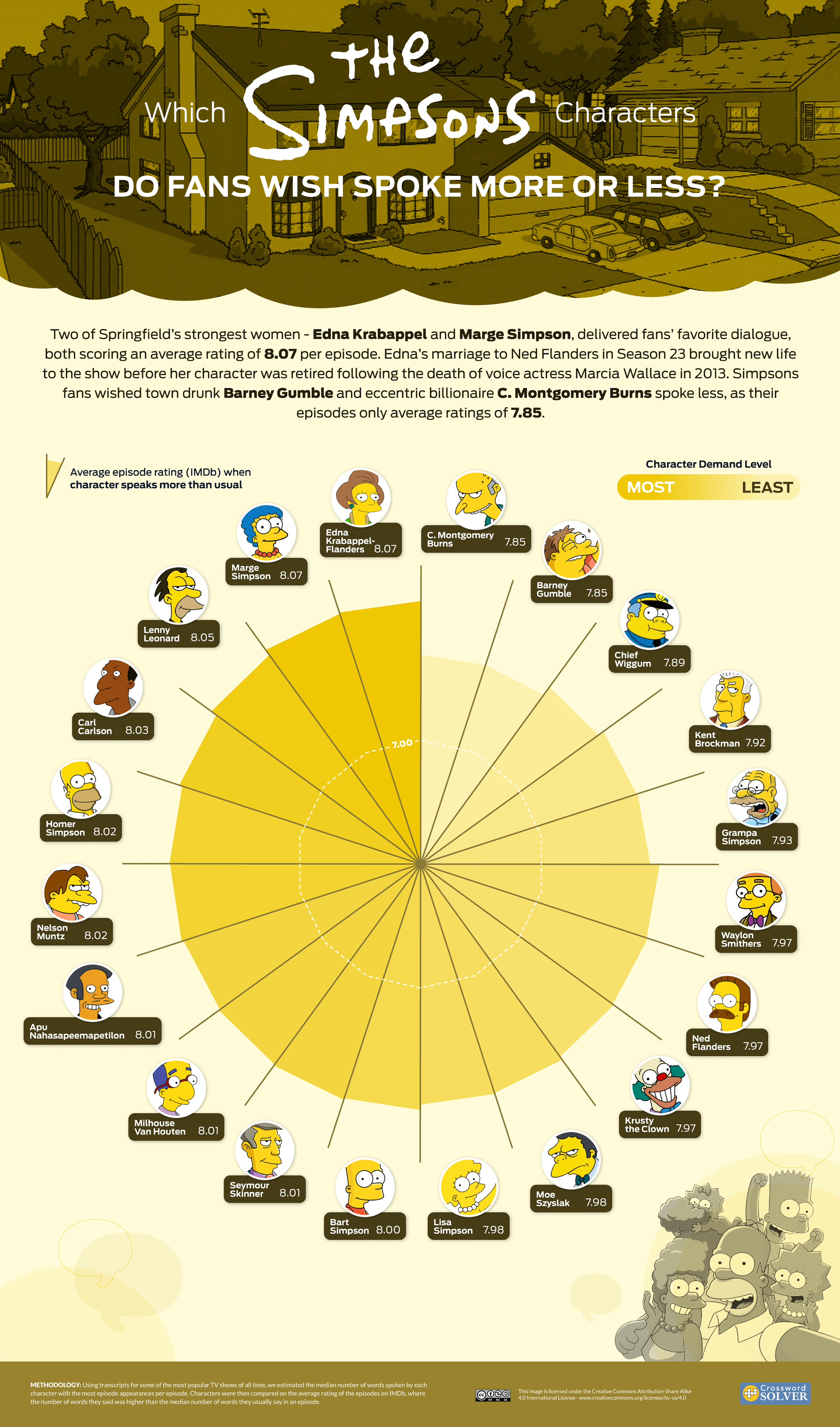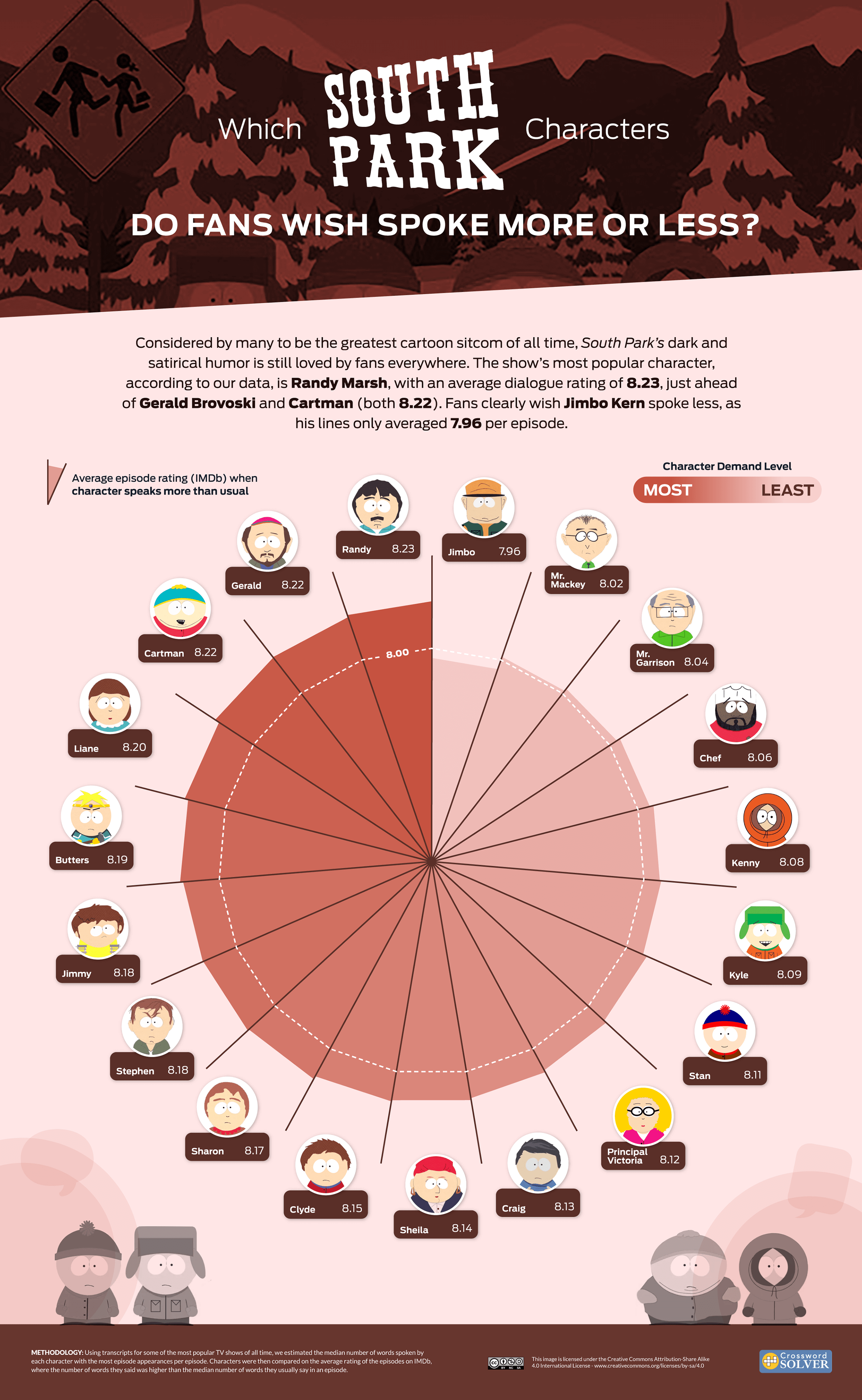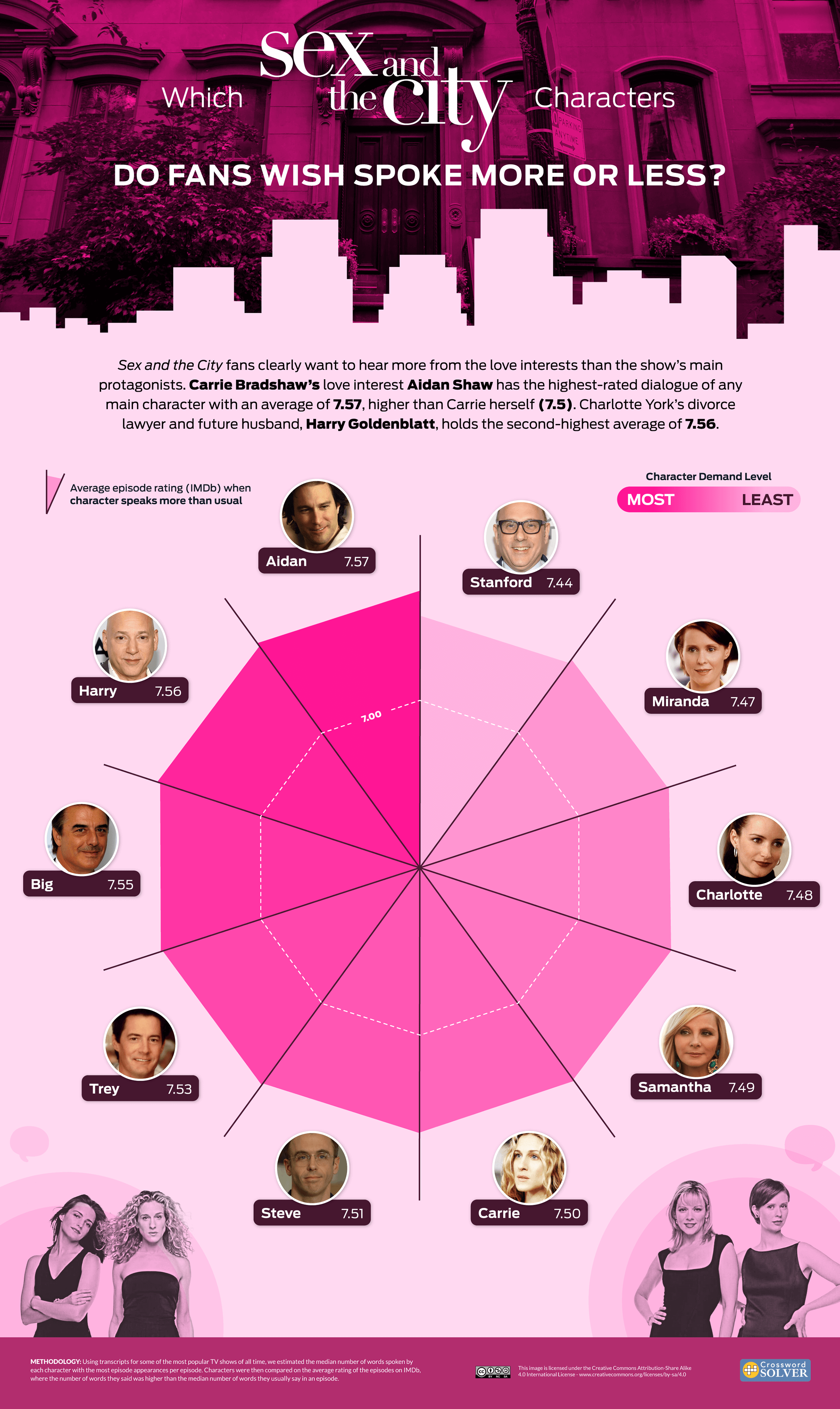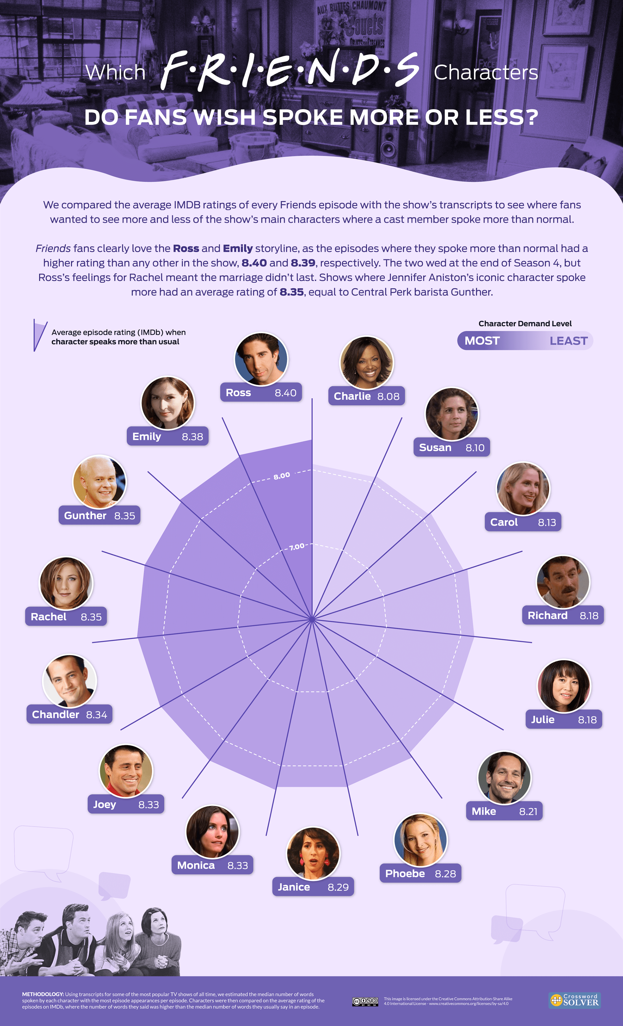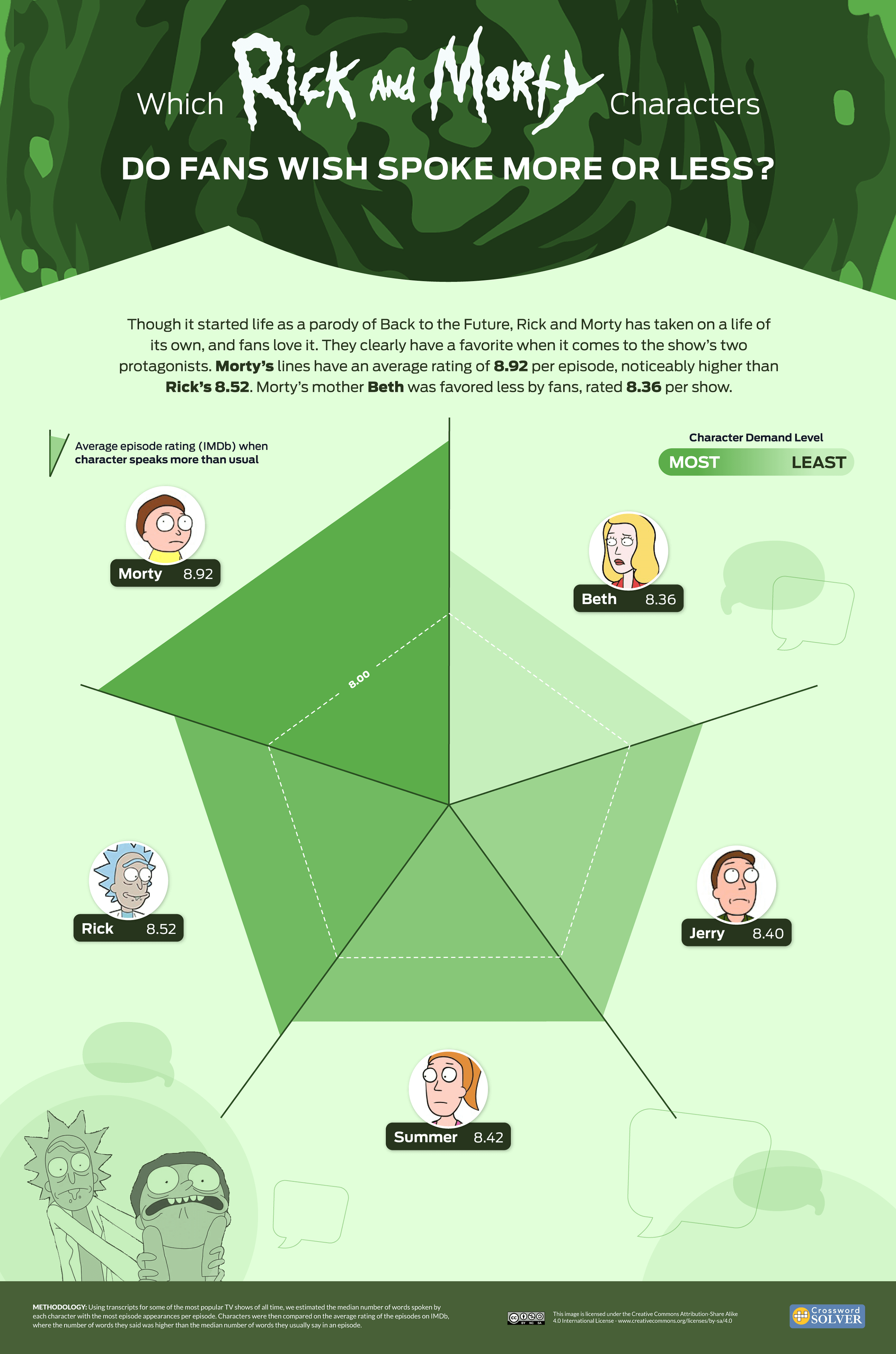 Crossword-Solver calculated the average number of words used by the most-regularly appearing characters for some of TV’s most popular live-action and animation shows. Then we identified the average IMDb rating for the episodes when each character spoke more often than usual. We determined the characters who have a higher average rating for the episodes where they’re more talkative to be the ones that fans would like to have more lines.