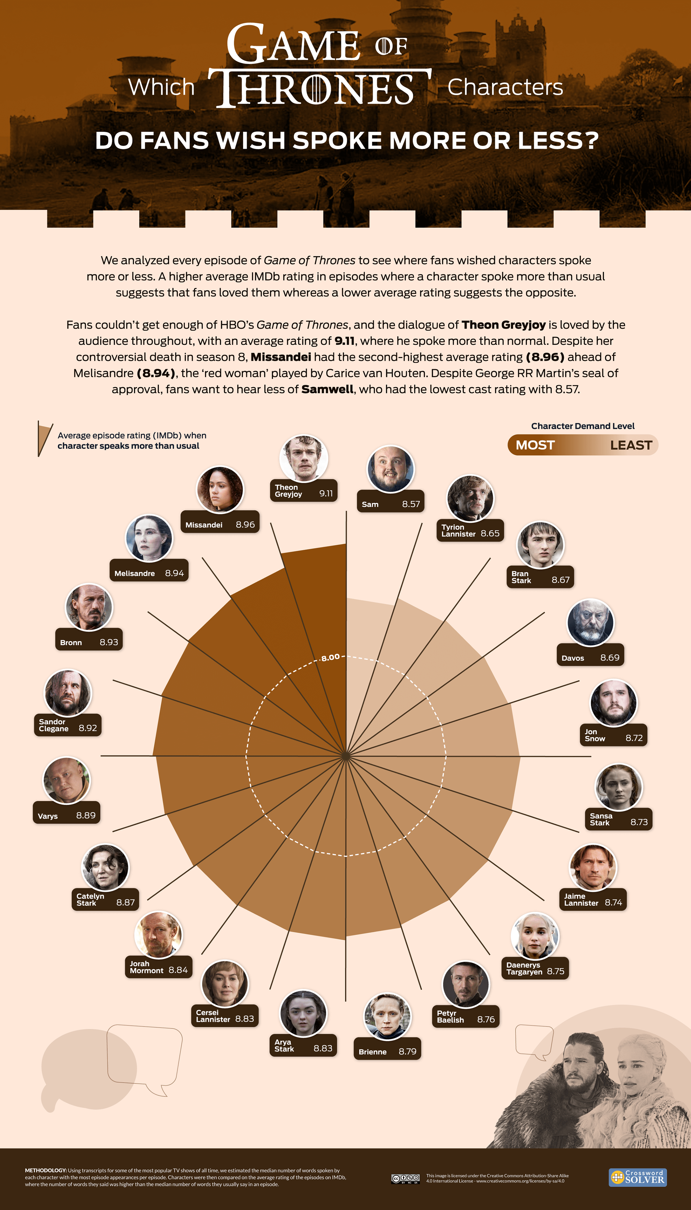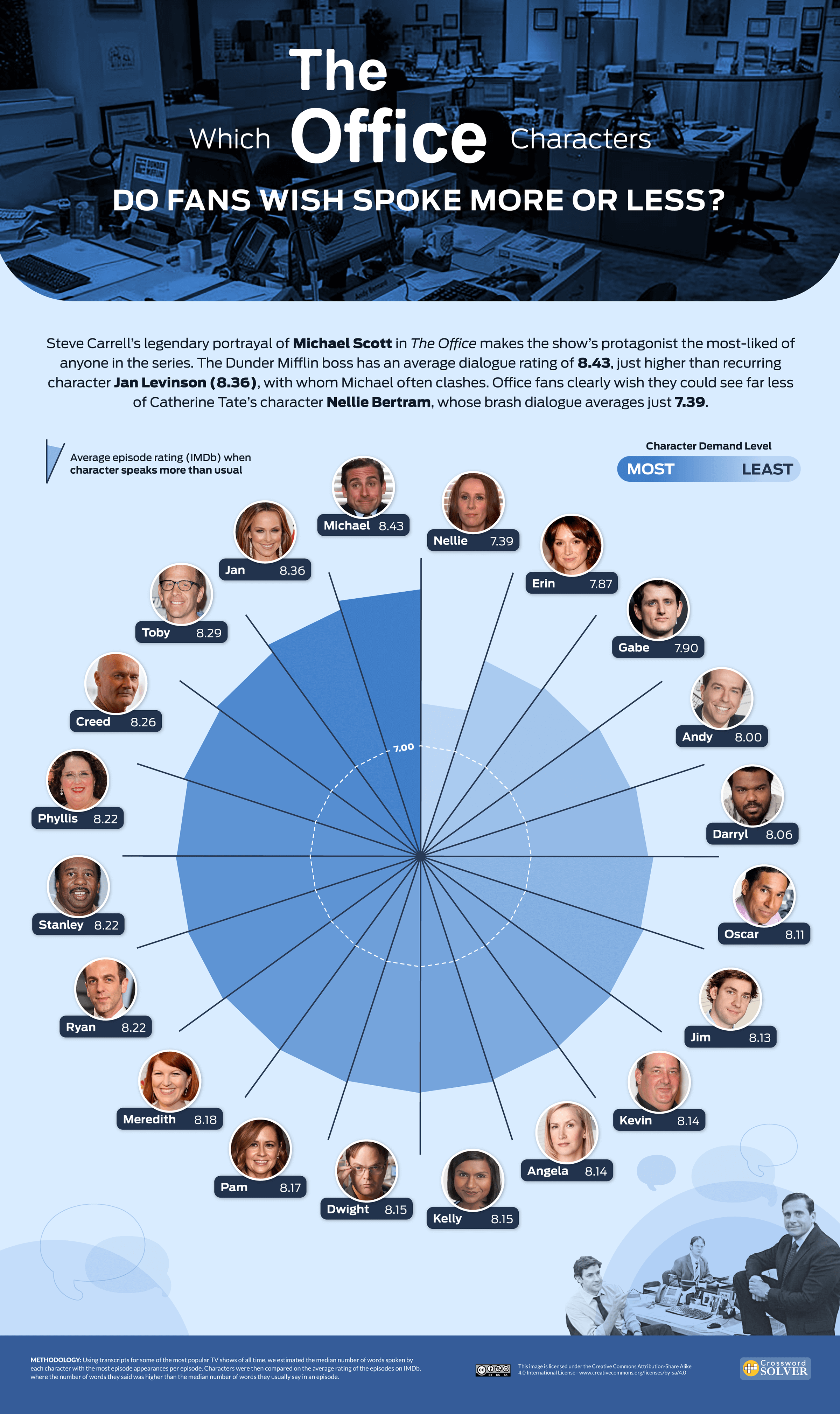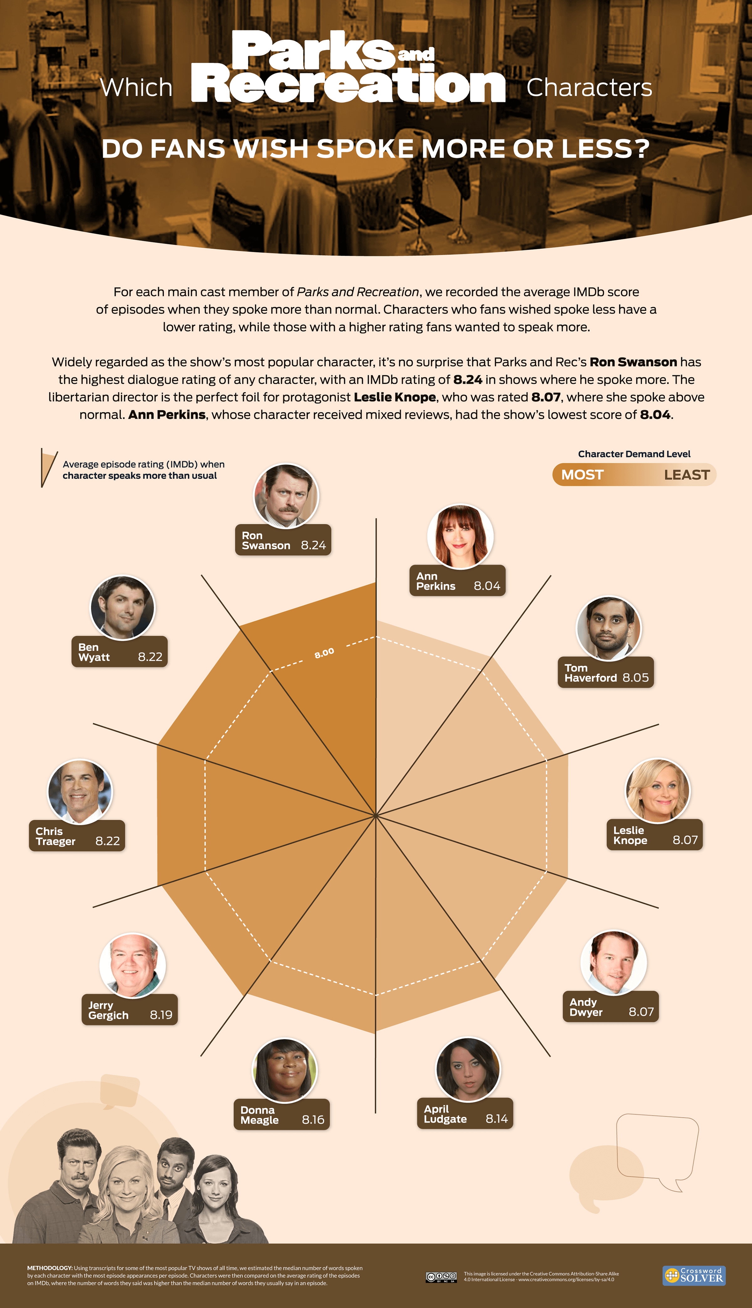 Once we sourced the rankings of each episode of the show from IMDb, characters were compared on the average rating of the episodes, where the number of words they said was higher than the median number of words they usually say in an episode.