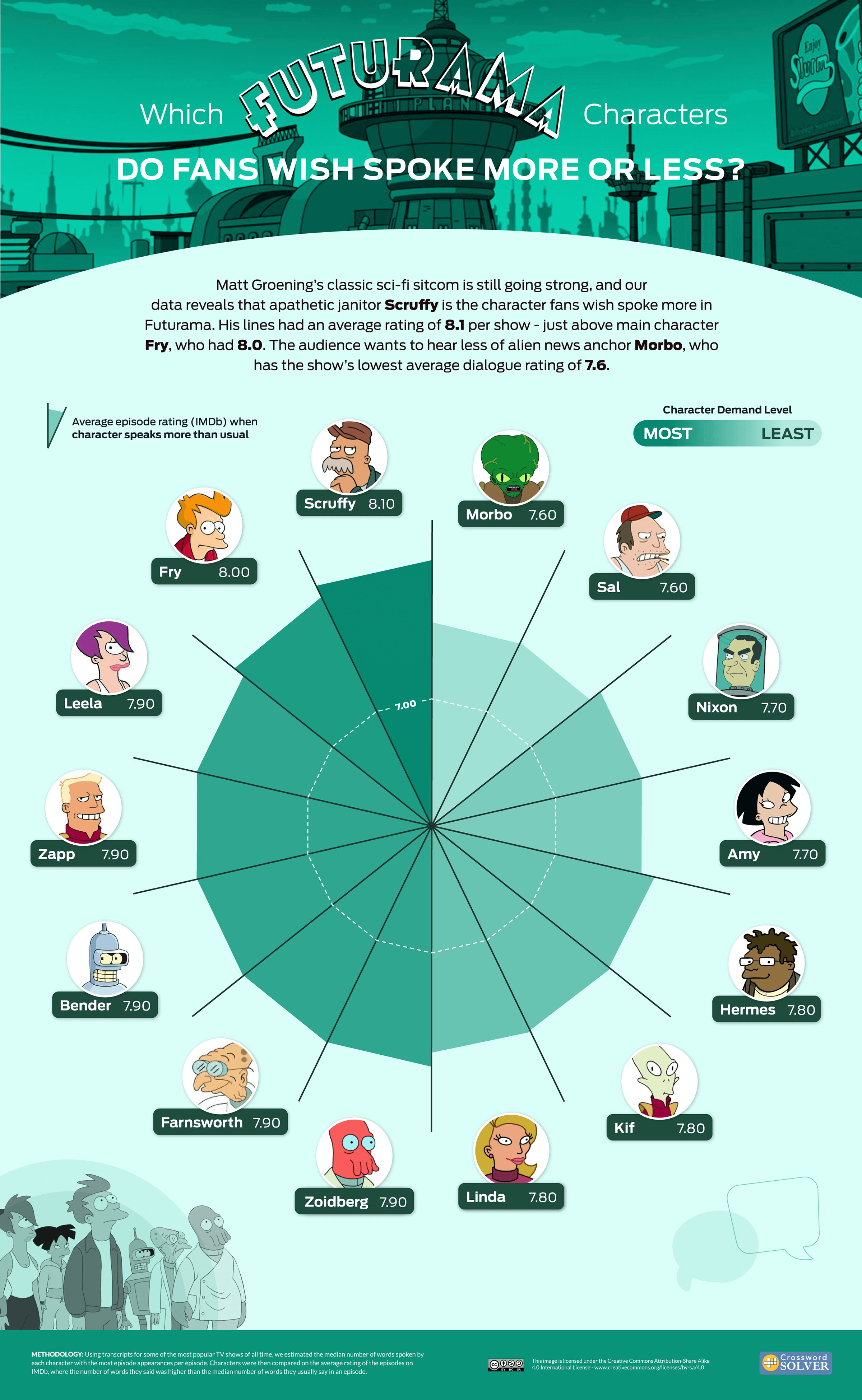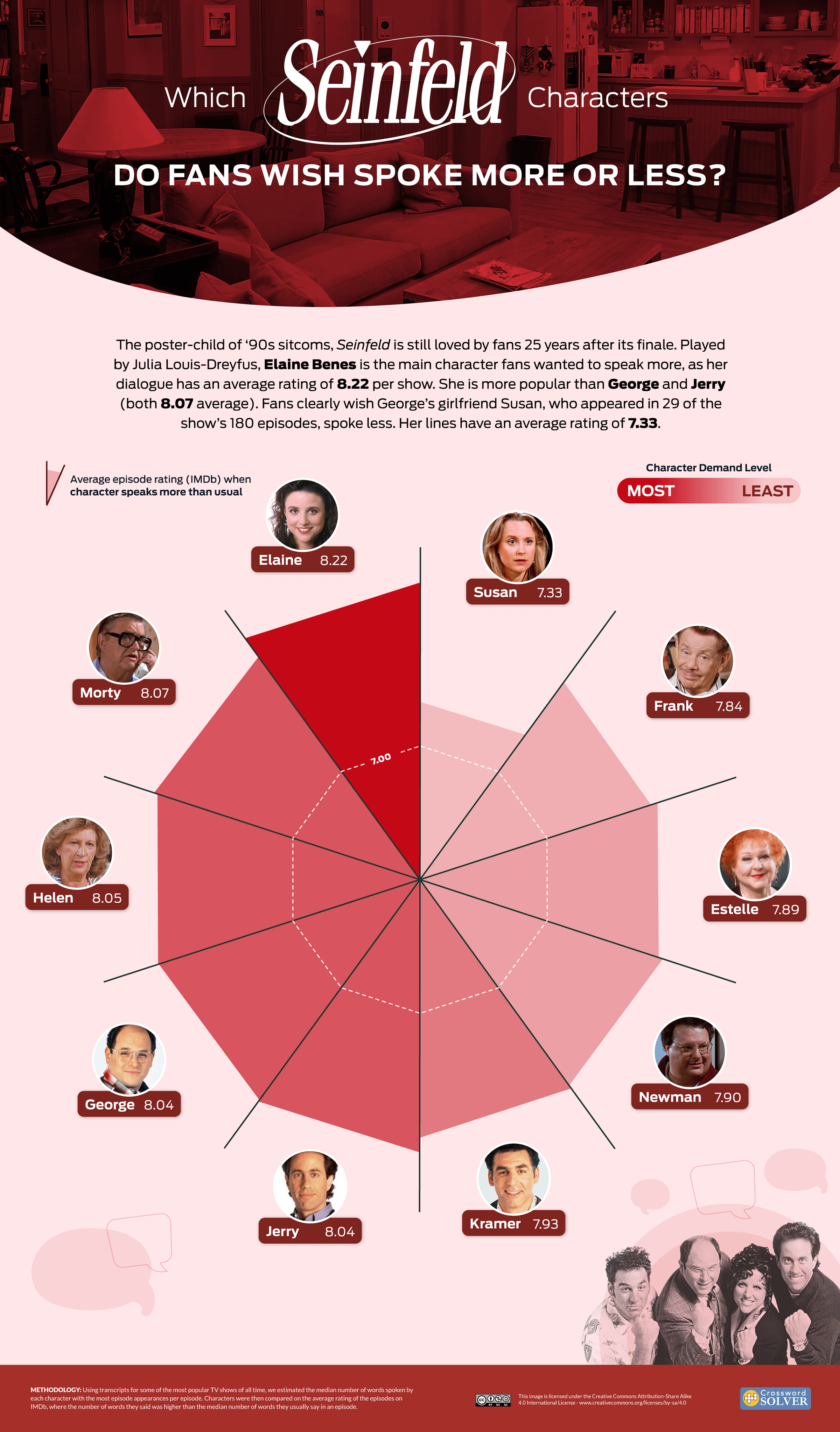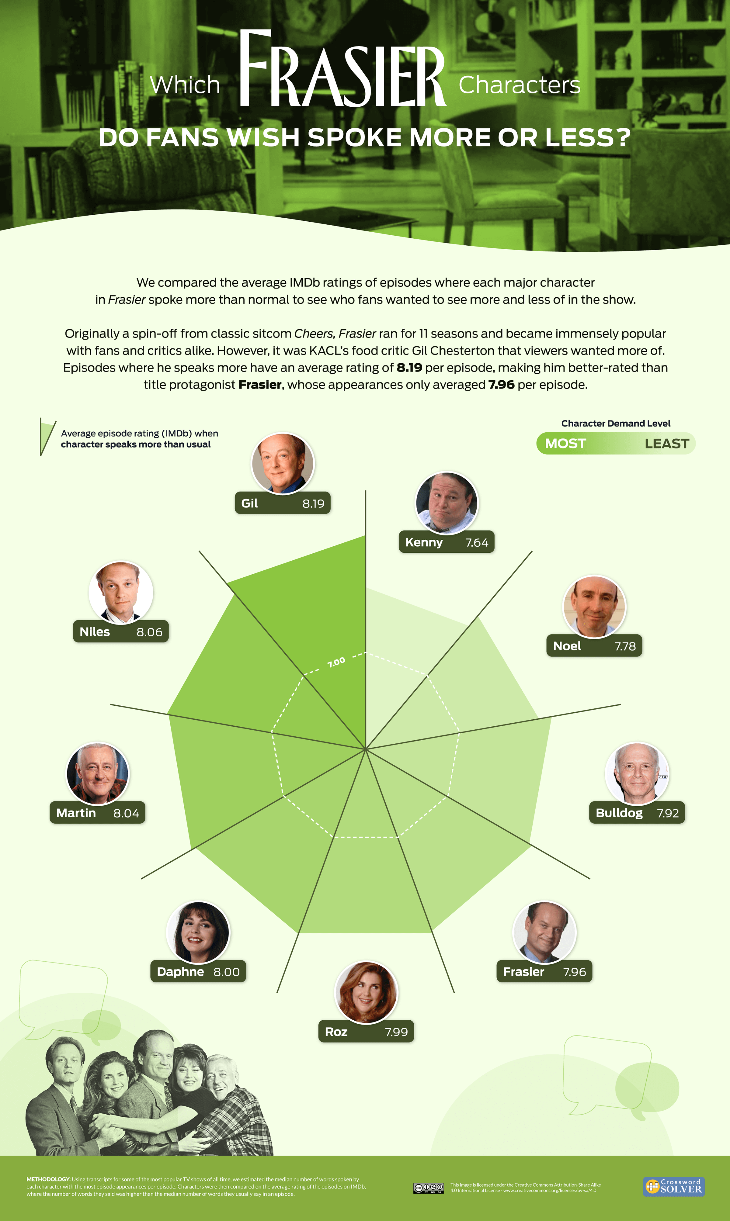Crossword-Solver is in the business of words. We wondered which characters’ lines actually improve top shows, from Seinfeld to SpongeBob, Game of Thrones to Parks and Recreation. So, we put on our data science hat and balanced the word count of popular characters used against the viewer ratings for each episode, revealing the characters audiences really want to hear more or less from. (And yes, Frank-heavy episodes of Seinfeld do get lower ratings.)