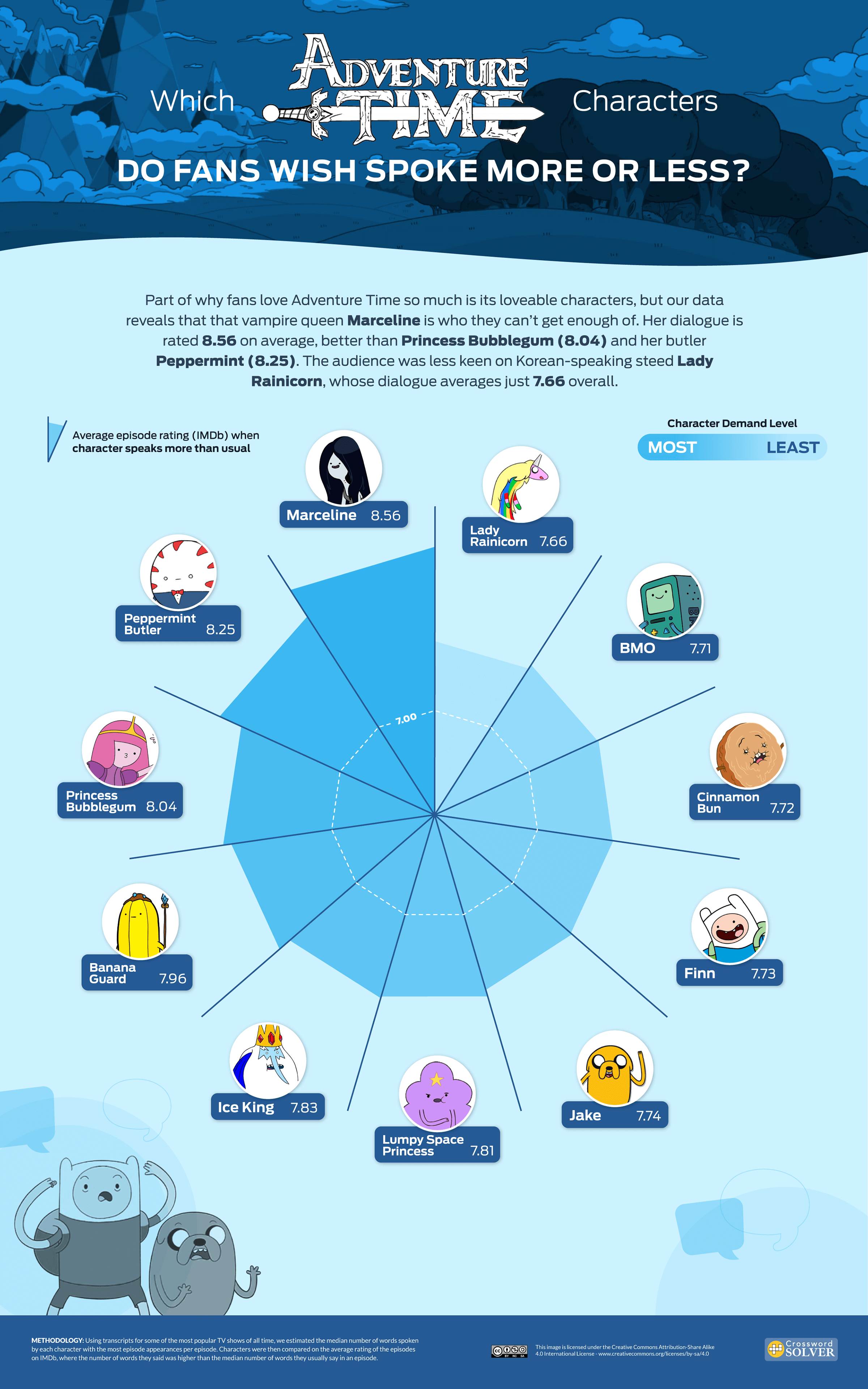 A bit harsh, perhaps, to put Lady Rainicorn in last place – she speaks little English and is mostly understood through a universal translator device. But even when you can understand her, Lady Rainicorn’s dialogue rarely has the bite of Adventure Time’s most popular talker: Marceline the Vampire Queen. “The only thing women love more than fun is excitement,” notes Marceline. “She needs to feel her blood pump, man! She needs to... BE CHASED BY WOLVES!”